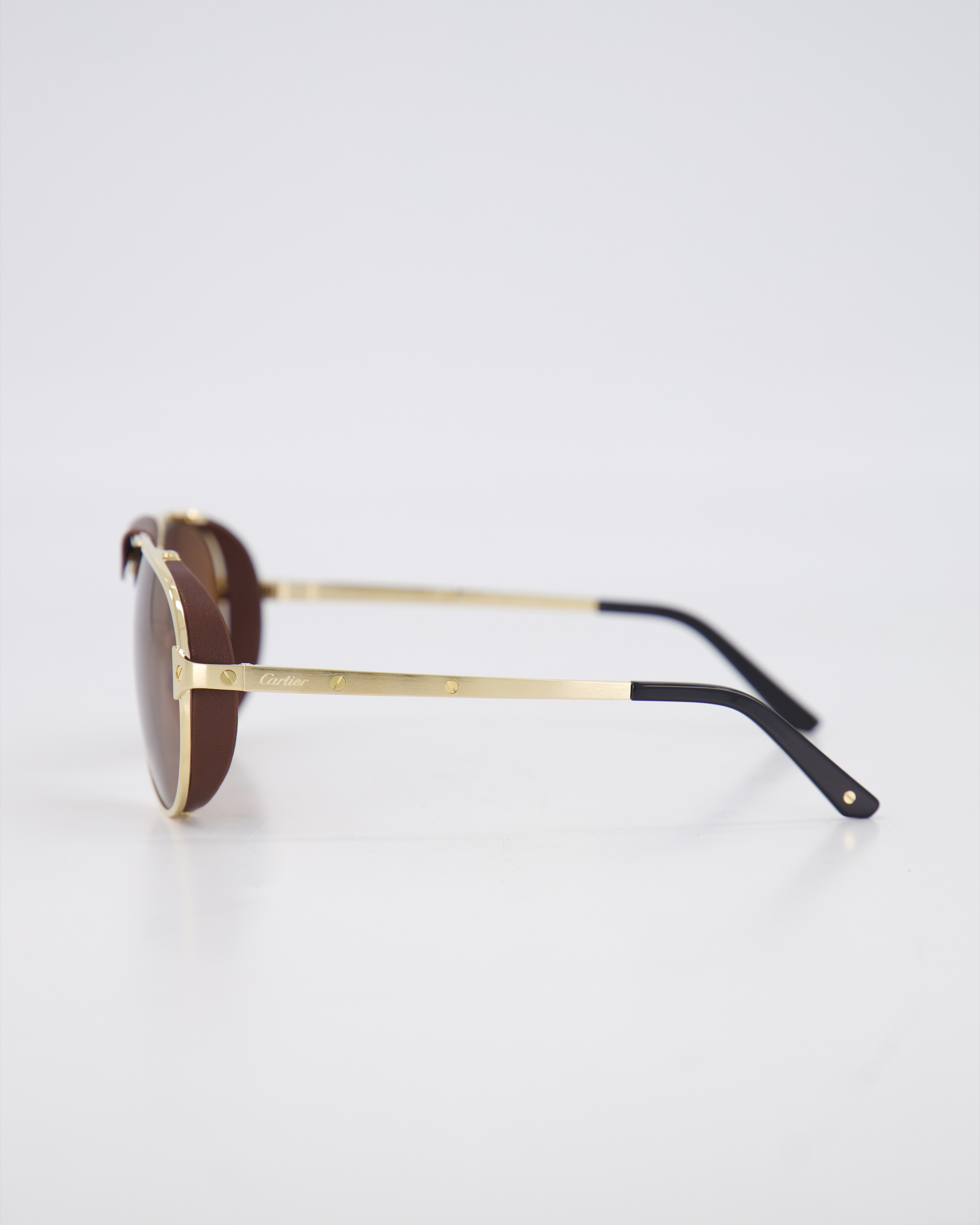 Emblematic Santos pilot shape for a 100% masculine design, with a strong and recognizable aesthetic. Introduction of leather blinders to elevate the offer through the unique Cartier savoir-faire. Identifiable Santos screws décor on bridge and temples. Acetate temple tips replicating the Santos watch case cut and enriched by the iconic Santos screws.