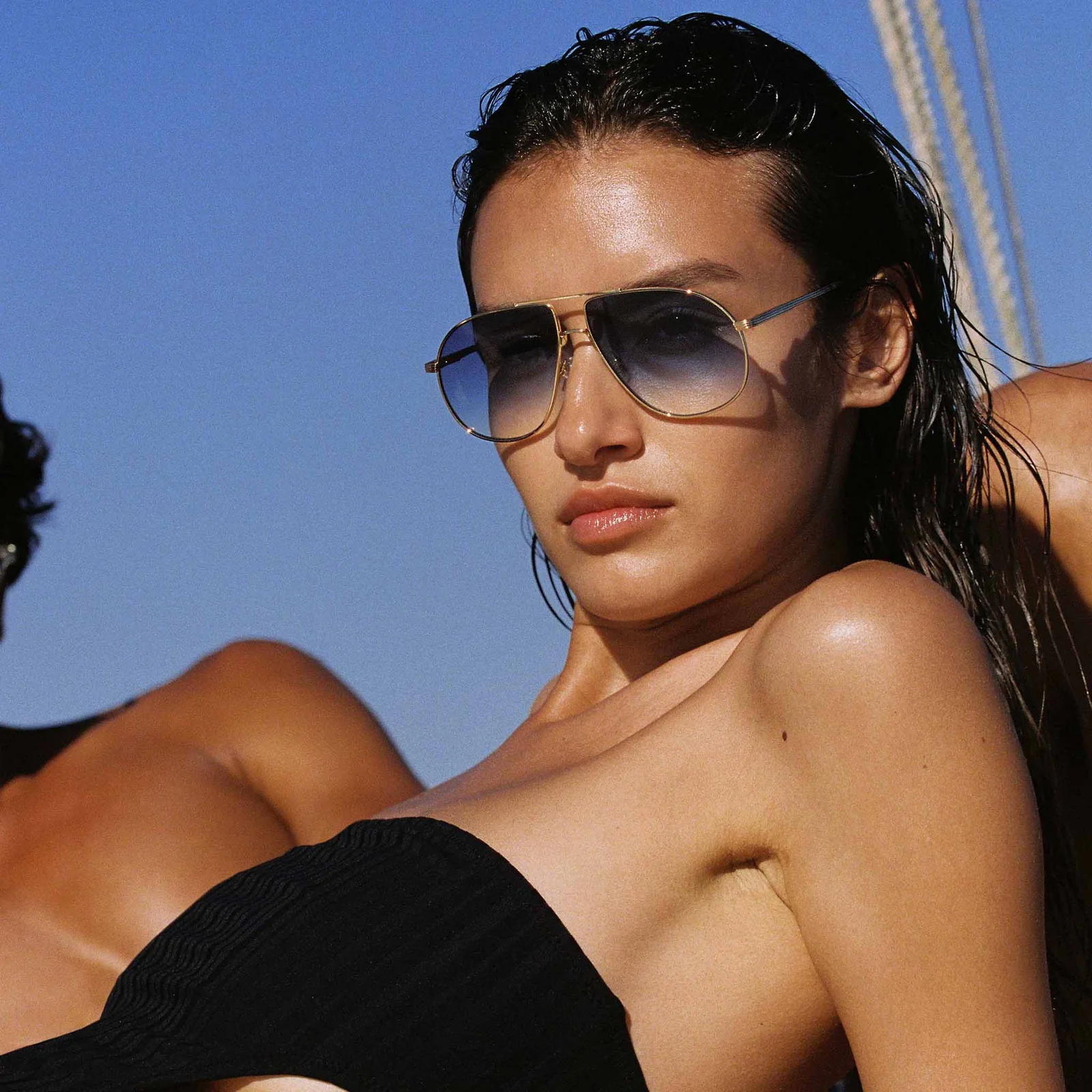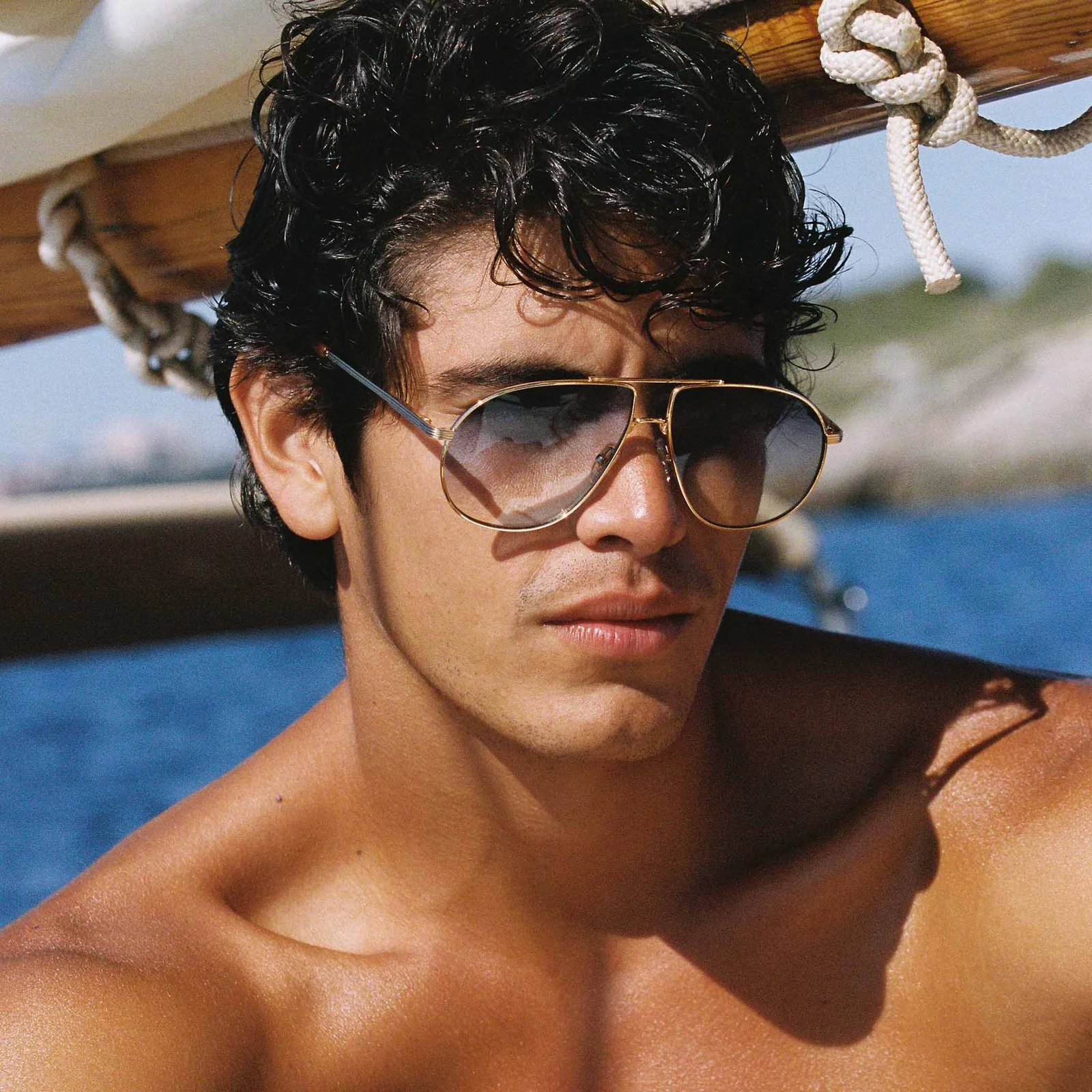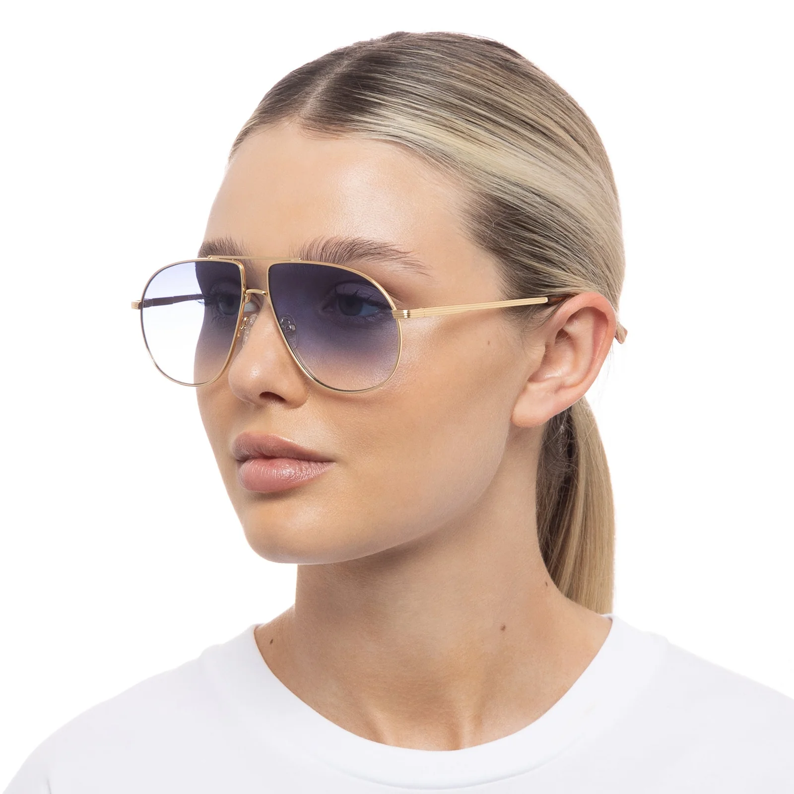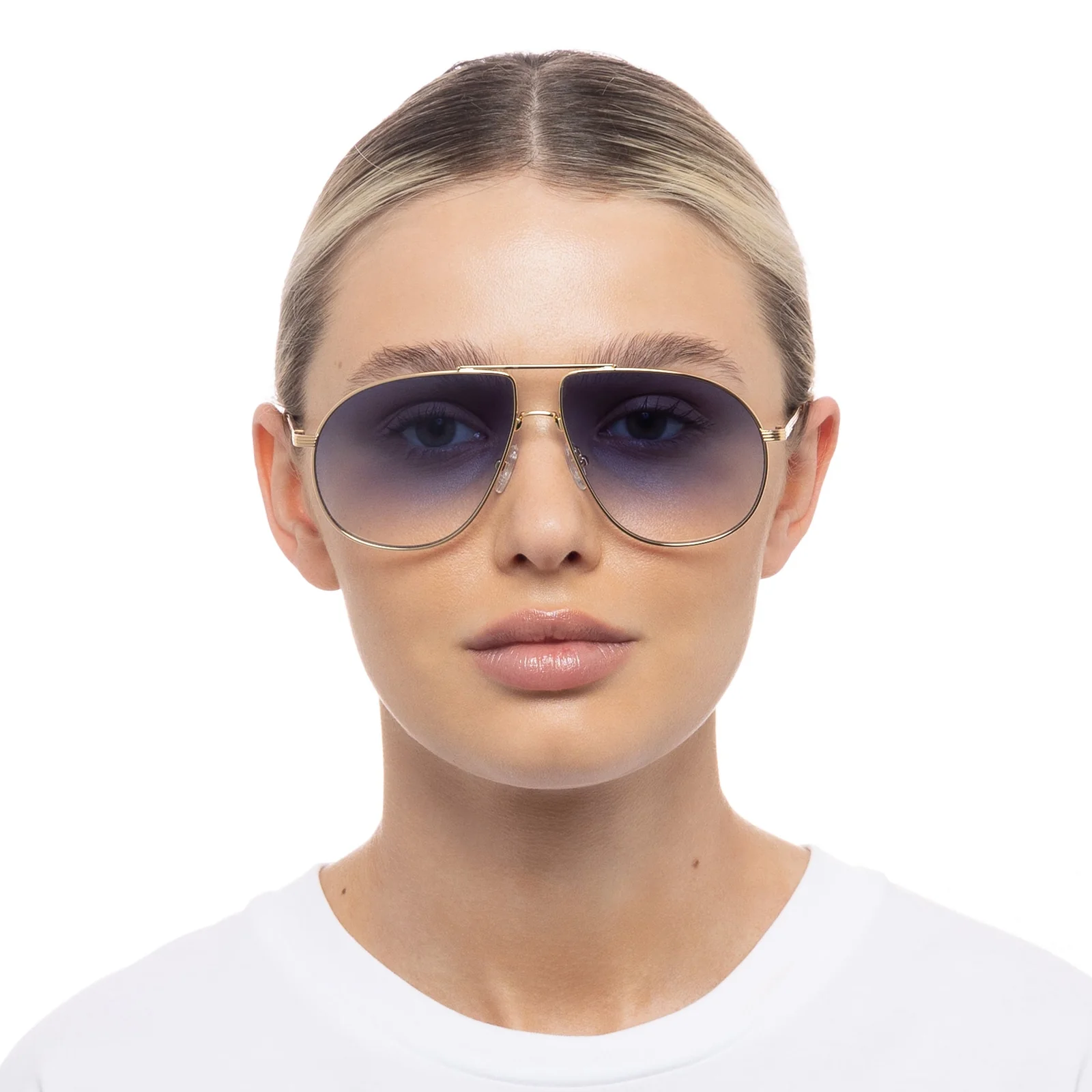 Finished in gold with contrast blue ombre lenses for a deluxe vintage vibe.
